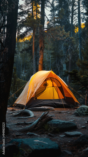 Yellow camping tent forest trees nature outdoor adventure wilderness camping ground pine trees peaceful scenic sunset hike survival shelter travel exploration tranquil cozy woodlands dusk evening
