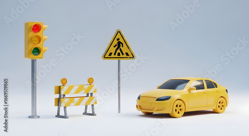 Yellow car, traffic light, pedestrian sign and barrier on white background