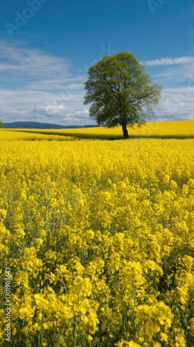 yellow, flower, field, tree, solitude, nature, landscape, bright, sky, cloud, spring, growth, rural, outdoors, blooming, beauty, calmness, agricultural, flora, seasonal, peaceful, countryside, sunny, environment, blue, earth, lush, texture, freshness, meadow