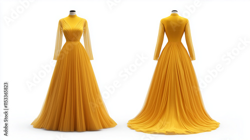 Yellow formal dress mockup front and back view isolated on white background for brand presentation