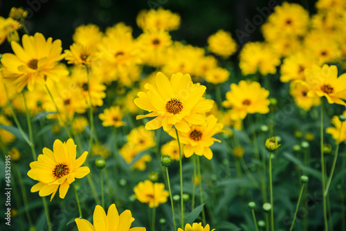 Yellow Heliopsis aster flower and bee close-up on a dark green blurred background in the garden, close up.