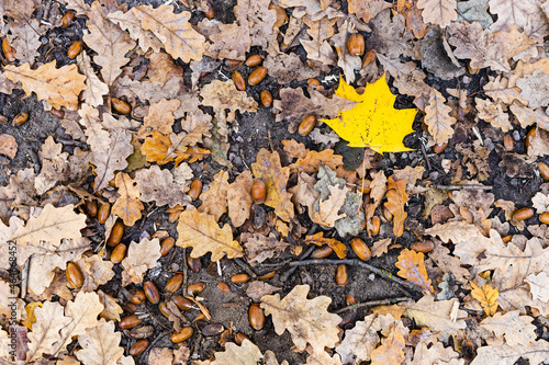 top, view, single, fallen, yellow, maple, leaf, dried, brown, oak, leaf, acorn, foliage, natural, nature, background, surface, up high, outdoors, meadow, forest, park, autumn, day, tree, fall, dry, season, weather, wood, landscape, scenic, moscow, russia, ground, land, horizontal, nobody, timberland, cover, covered, colourful, clearing, seasonal
