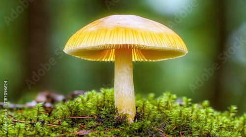 Yellow Mushroom Growing in Lush Green Moss