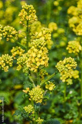Yellow Mustard Flowers field - Sinapis Alba ( Mustard Flower ) plant with flowers and buds