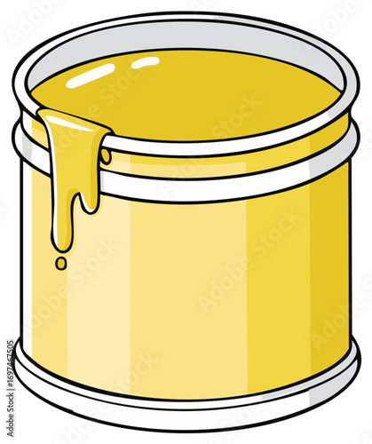 Yellow paint drips from an open can with clean lines and a simple artistic style
