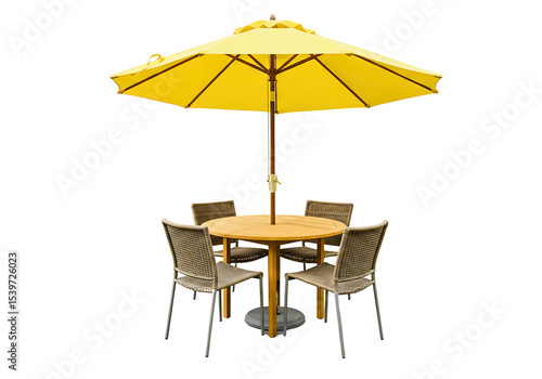 Yellow patio umbrella with wooden table and chairs isolated on transparent background