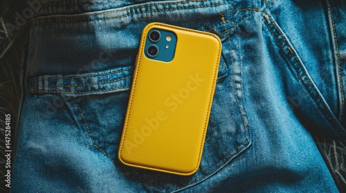 phone, case, yellow, denim, pocket, jean, leather, mobile, technology, device, accessory, fashion, style, design, colours, modern, contemporary, product, detail, close, up, image, object, texture, material, background, photograph, photo, digital, view, top, shot, flat, lay, bright, display