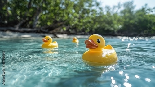 Yellow rubber ducks float in shallow turquoise water, near a sandy beach