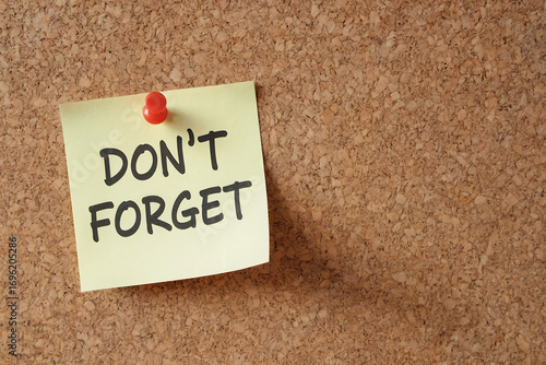 Yellow sticky note with D O N' T F O R G E T text pinned to corkboard paper dont forget