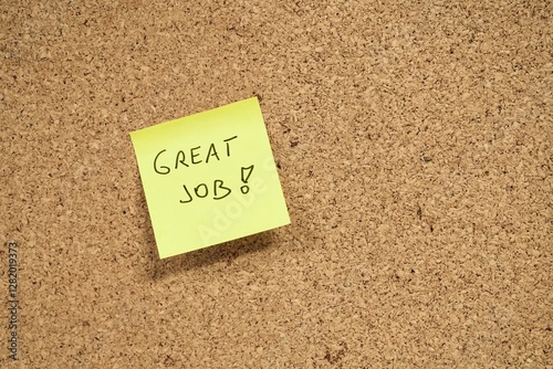 Yellow Sticky Note with "Great Job!" Written on Corkboard
