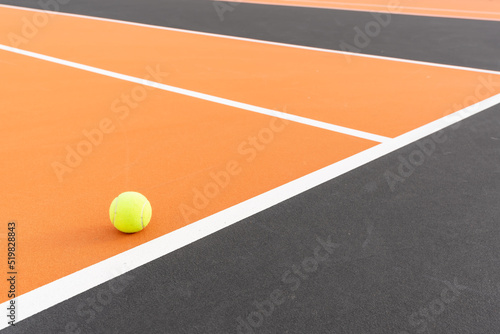 Yellow tennis ball at orange tennis court with white baseline and black out of bounds