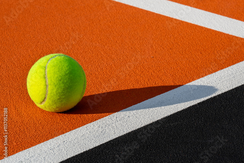 Yellow tennis ball on orange and black tennis court - pickleball court with white baseline and black out of bounds