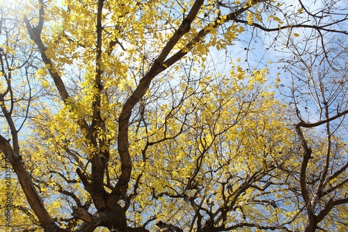 tree, autumn, sky, nature, fall, leaf, forest, yellow, leaf, tree, blue, branch, season, tree branch, park, wood, foliage, green, colours, wood, landscape, birch, trunk, plant, outdoors