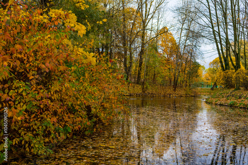 Yellow trees on the bank of a reservoir, golden autumn in the park