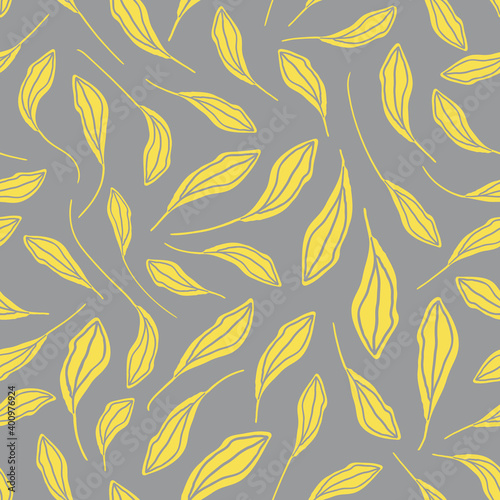 Yellow vector narrow leaves seamless pattern background. Organic hand drawn gold foliage on warm grey backdrop. Elegant botancial painterly illustration. At home crafted design vibe. All over print.