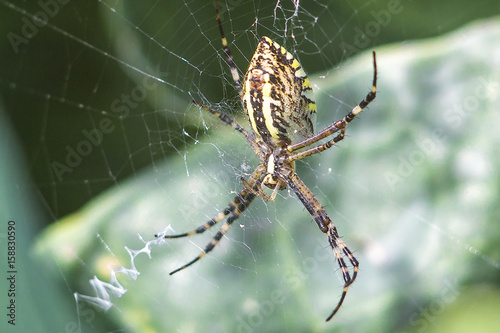 Yellow-black orb-weaver spider. Argiope Bruennichi, or the wasp-spider on the web, cobweb against green natural background, closeup.