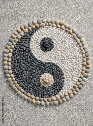 yin, yang, symbol, mosaic, pebble, stone, circle, sand, balance, harmony, design, art, spiritual, eastern, philosophy, circular, pattern, geometric, black, white, nature, creation, light, dark, contrast, complement, intricate, detailed, artistic, sacred, ancient, zen, meditation, peace, calm, sharpened, energy, universe, cosmos, craft