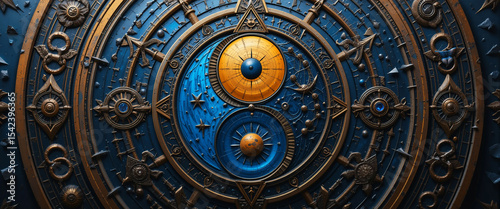 yin and yang, balance, duality, zodiac, ancient, clock, time, astrology, old, astronomic, gold, circle, spiritual, cosmic, celestial bodies, solar energy, home decor, harmony, decorative