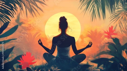 yoga, meditation, silhouette, woman, sunset, meditating, exercise, lotus, body, pose, health, sun, relaxation, vector, nature, illustration, relax, people, fitness, spiritual, beauty, sitting, peace, person, calm
