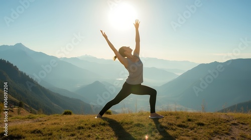 Yoga with a Mountain View – A yogi in Downward Dog pose on a grassy hill, overlooking a panoramic view of mountains and valleys, with the sun shining brightly overhead.