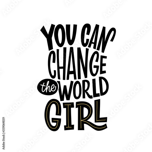 You can change the world, girl. Bright, juicy postcard with flowers and lettering. Dark phrase on a light background surrounded by flowers, leaves, hearts. Calligraphy and lettering, cool print.