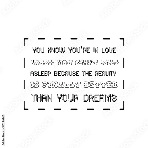 You know you’re in love when you can’t fall asleep because the reality is finally better than your dreams. Calligraphy saying for print. Vector Quote