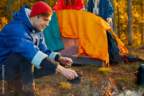 young active caucasian hiking man trying to light a fire during a trip in mountains, keep warm after a long hike while women pitch a tent in the background. hiking concept