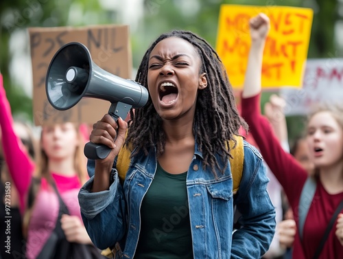 activist, protest, megaphone, crowd, demonstration, rally, city park, missy, dreadlocks, signs, advocacy, community, empowerment, expression, equality, movement, awareness, engagement, youth, change, solidarity, passion, emotional, environment, gathering, oneness, right, climate change, peace, diversity, inclusion, policy, freedom, action, support, issue, determination, culture, education, resilience, march, human rights, participation, motivation, urban