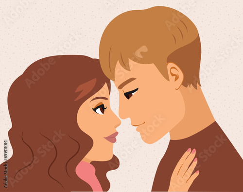 Young adult cute couple side view looking at each other illustration. Boyfriend and girlfriend in love vector flat cartoon style