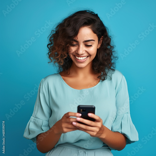 Young adult, smiling woman, holding mobile phone, engaging with smartphone, typing message, ecommerce shopping, app usage, cellphone interaction, isolated on blue background, 4K resolution, vibrant