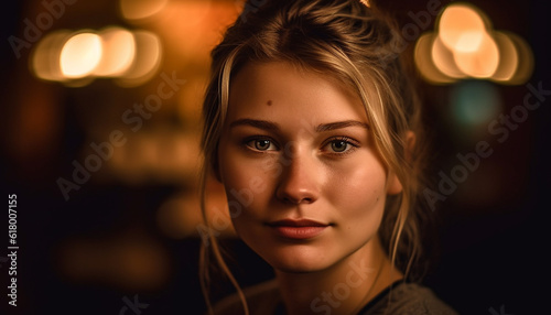Young adult woman, Caucasian ethnicity, smiling, looking at camera indoors generated by AI