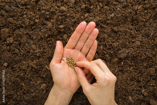Young adult woman fingers taking beet seeds from palm for planting in fresh dark soil. Closeup. Preparation for garden season. Point of view shot. Top down view.