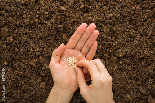 Young adult woman fingers taking cucumber seeds from palm for planting in fresh dark soil. Closeup. Preparation for garden season. Point of view shot. Top down view.