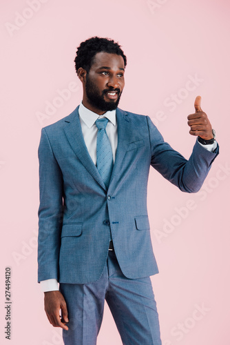 young african american businessman in suit showing thumb up, isolated on pink