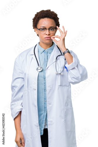 Young african american doctor woman wearing medical coat over isolated background mouth and lips shut as zip with fingers. Secret and silent, taboo talking
