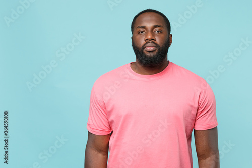 Young african american man guy in casual pink t-shirt posing isolated on pastel blue wall background studio portrait. People sincere emotions lifestyle concept. Mock up copy space. Looking camera.