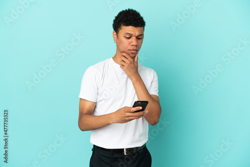 adult, african, afro, american, background, blue, brunette, mobile phone, mobile phone, cellular, colours, colourful, communicate, communication, conversation, curly, excitement, gesture, guy, coiffure, idea, cyberspace, isolated, male, man, mobile, pensive, people, person, portrait, smart, smartphone, solution, technology, phone, thinks, thoughtful, thought, wall, young, youth, man, phone