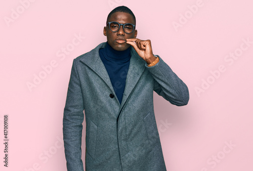 Young african american man wearing business clothes and glasses mouth and lips shut as zip with fingers. secret and silent, taboo talking