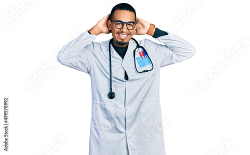 Young african american man wearing doctor uniform and stethoscope relaxing and stretching, arms and hands behind head and neck smiling happy