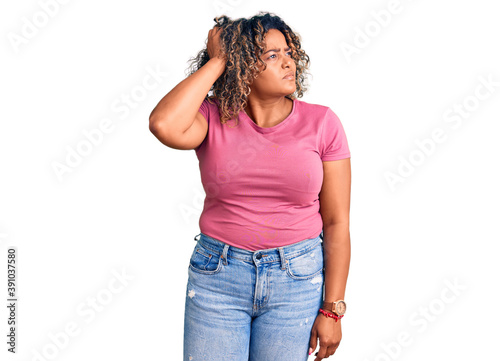 Young african american plus size woman wearing casual clothes confuse and wondering about question. uncertain with doubt, thinking with hand on head. pensive concept.