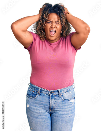 Young african american plus size woman wearing casual clothes crazy and scared with hands on head, afraid and surprised of shock with open mouth