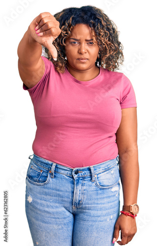 Young african american plus size woman wearing casual clothes looking unhappy and angry showing rejection and negative with thumbs down gesture. bad expression.