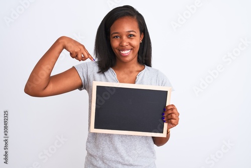 Young african american woman holding blank school blackboard over isolated background with surprise face pointing finger to himself