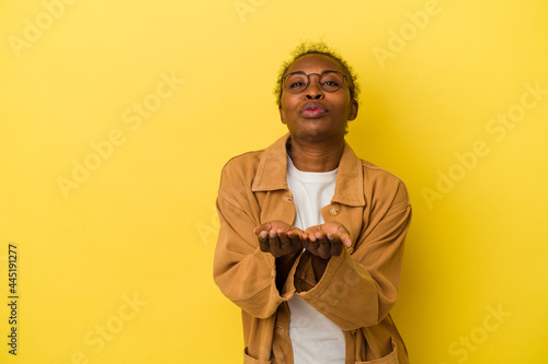Young african american woman isolated on yellow background folding lips and holding palms to send air kiss.