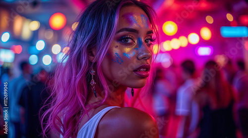 nightlife, neon, portrait, bokeh, make-up, fashion, glamour, party, beauty, entertainment, african, american, woman, youth, face, paint, artistic, glow, pink, hair, purple, blue, light, club, dance, night, vibrant, style, earring, jewellery, model, urban, modern, trendy, celebration, festival, culture, expression, confidence, feminine, elegant, dramatic, lighting, atmosphere, crowd, background, cosmetic, creative, diversity