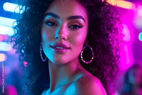 young, african, female, curly, neon, portrait, glowing, vibrant, colourful, fashion, style, beauty, glamourous, confident, nightlife, alluring, earring, make-up, smile, attractive, trendy, urban, elegance, chic, aglow, nightclub, atmosphere, high-coloured, modern, party, expression, charisma, feminine, radiant