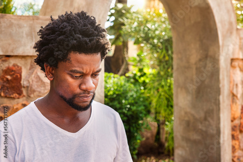 african, man, single, natural, hair, adult, african american, beard, black, ethnicity, guy, people, portrait, person, afro, expression, standing, american, photogenic, young, one person, ethnic, expressive, male, student, copy space, horizontal, outdoors, wall, rent, outside, young men, young adult, stone wall, arch, garden, park, looking down, vegetation, green, sunset, afternoon, day, landscaped, daytime, daylight, coiffure