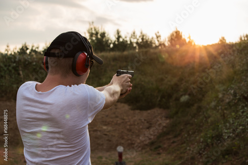 Young and handsome caucasian blond guy in military training camp for secret service agents shooting and firing weapon gun pistol at the distant target to kill criminal enemy with bullet