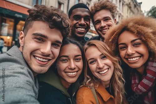 Young and vibrant friends of different ethnic backgrounds taking a selfie together against a picturesque outdoor backdrop