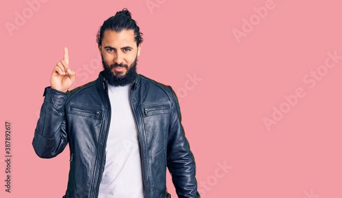 Young arab man wearing casual leather jacket showing and pointing up with finger number one while smiling confident and happy.